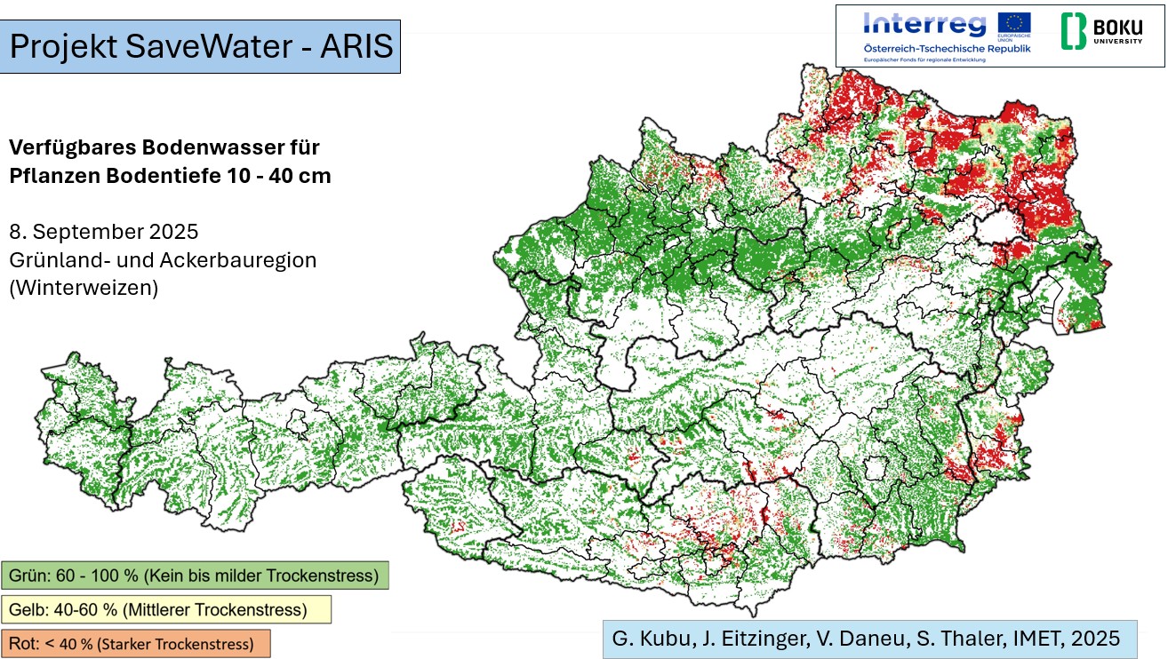 Aktuelle Trockenheit 09.08.2025 - Gruenland und Winterweizen in Ackerbauregion