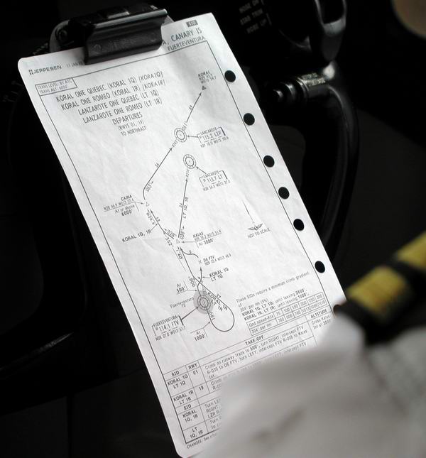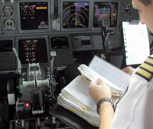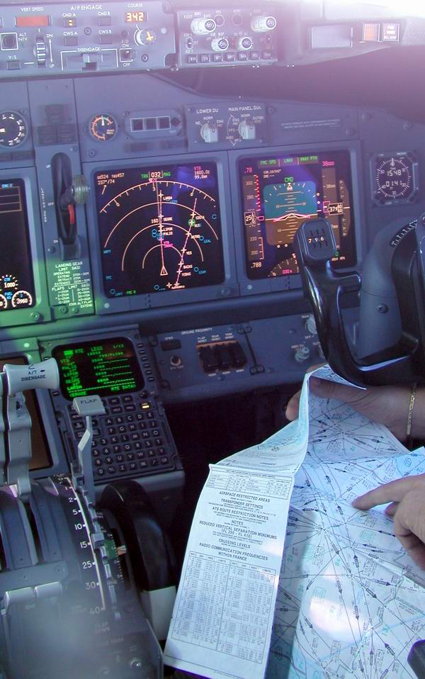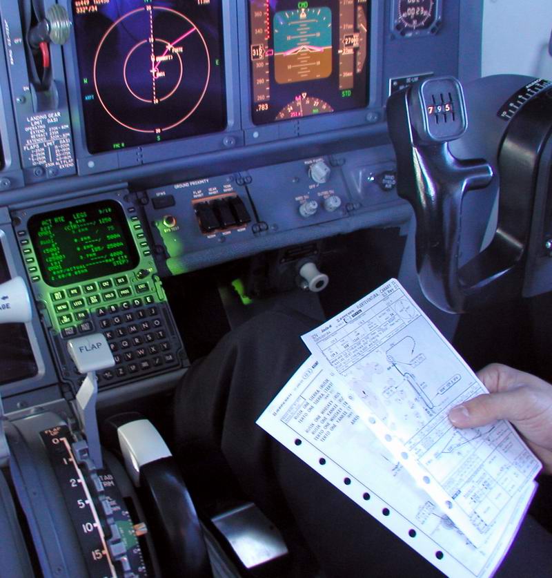 1st Officer sucht in den Enroutmentcharts den Weg Cpt. programmiert den FMC |