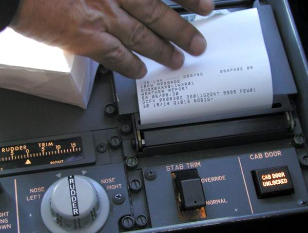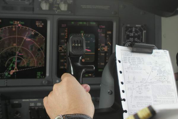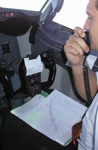 Wetterbericht und Flugplan bereit 1st Officer macht die Kabinenansage |