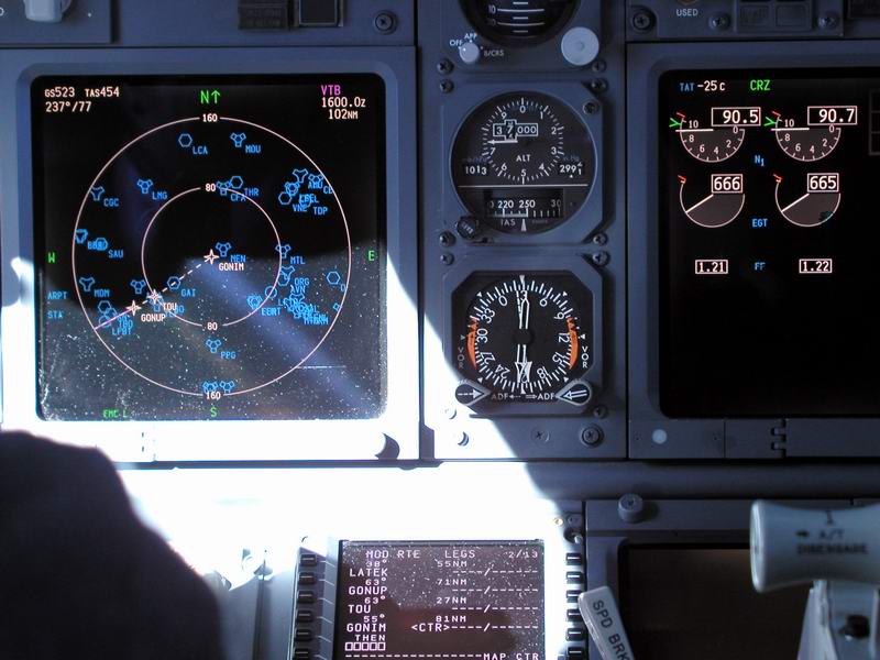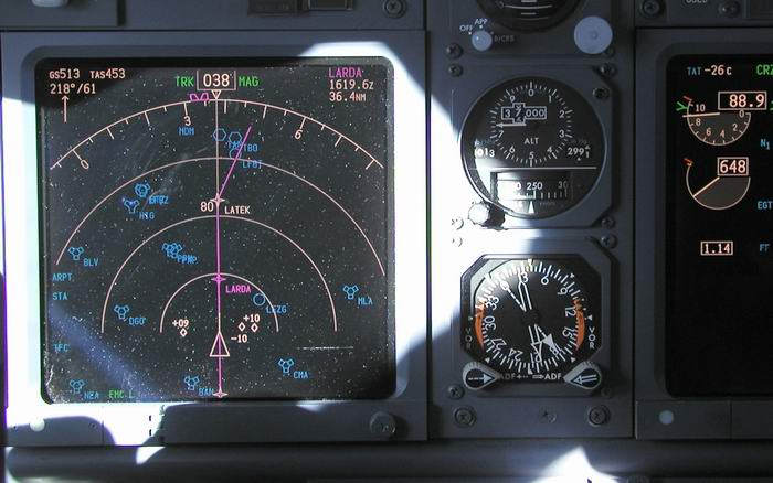 Auf FL380, Im Diplay oben: Spanische Küste und Gibraltar |